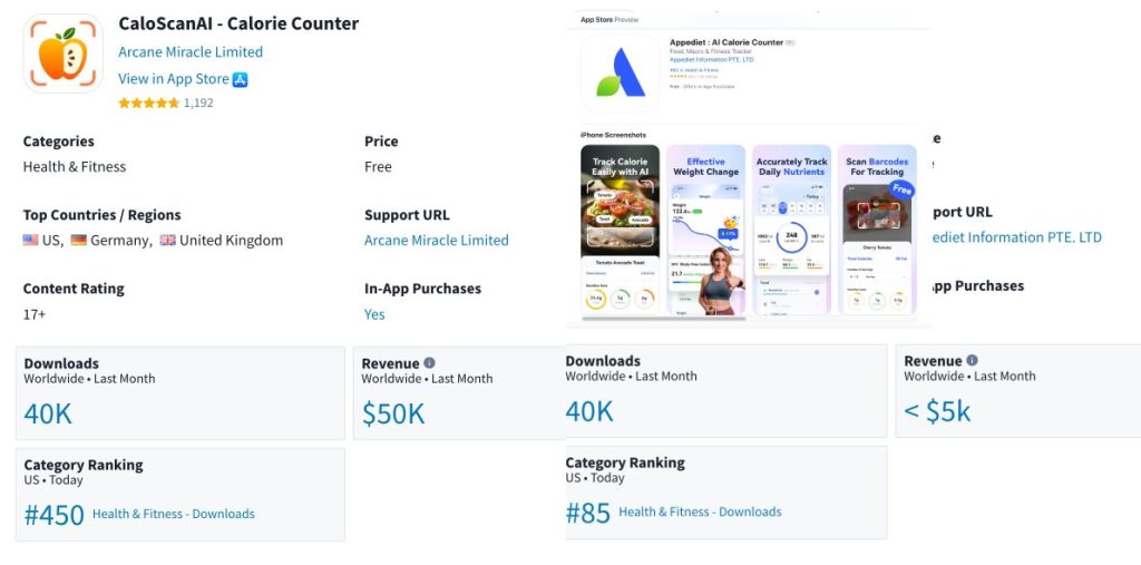 Appediet: Ranking at #85 in the App Store, Appediet manages about 40K monthly downloads. They’ve got 6.5 million views across their two TikTok accounts (@appediet.official and @appediet), but nothing that really stands out.