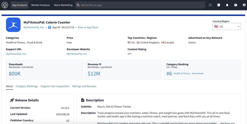 FitnessPal Calorie Counter: The big player in the space, FitnessPal is doing $12M in revenue with 800K app downloads. They’re also using targeted influencer marketing, along with other channels.