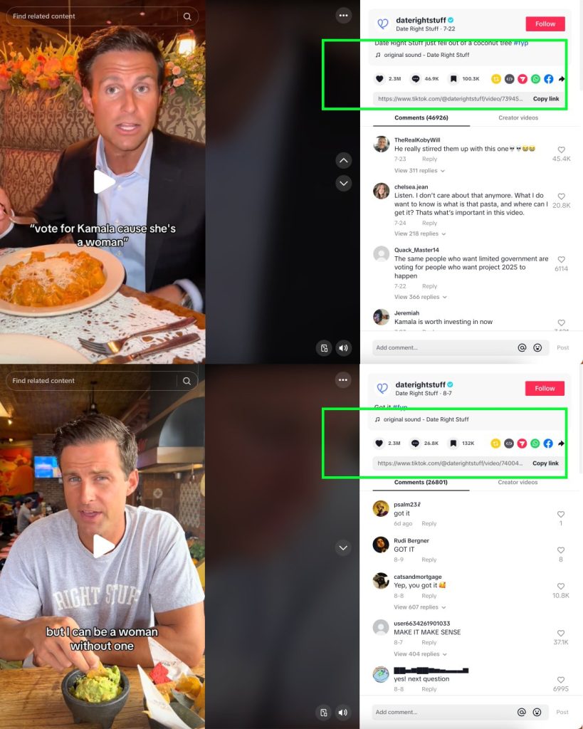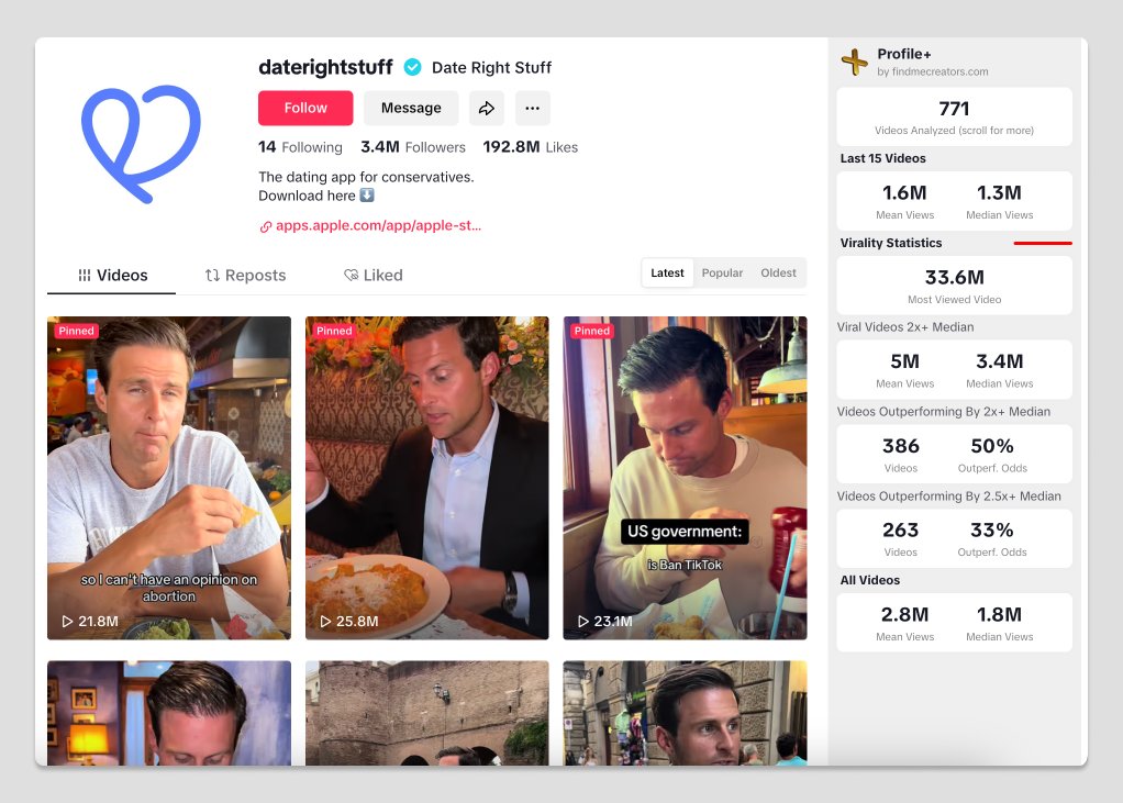 Date Right Stuff’s TikTok account, @daterightstuff, boasts over 3.3 million followers and has garnered more than 2 billion views. Their content strategy involves posting short, relatable videos that often feature founder John McEntee himself. These videos humorously tackle left-wing ideologies and highlight conservative viewpoints, striking a chord with their target audience.