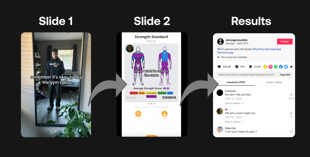 These hooks are a hit with the peculiar audience of a men’s fitness app. They resonate and make you long for what’s next. That’s the idea behind a slideshow: you want to see what’s in the next slide(s). Hence, you create engagement on the video, which then tells the algorithm that it is interesting content that should be distributed to more people.