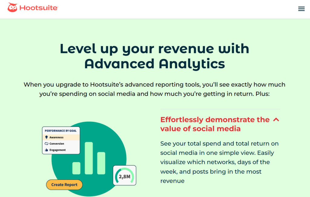 - Analytics and reporting: With detailed reports on engagement, impressions, and follower growth, Hootsuite helps you measure the success of your social media efforts.